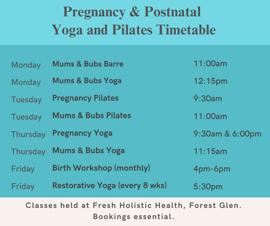 For class descriptions and bookings click the links below. Pregnancy Yoga & PilatesMums & Bubs Yoga, Pilates and BarreBirth WorkshopsRestorative Yoga . Studio Location Fresh Holistic Health, Shop 11/330 Mons Rd, Forest Glen